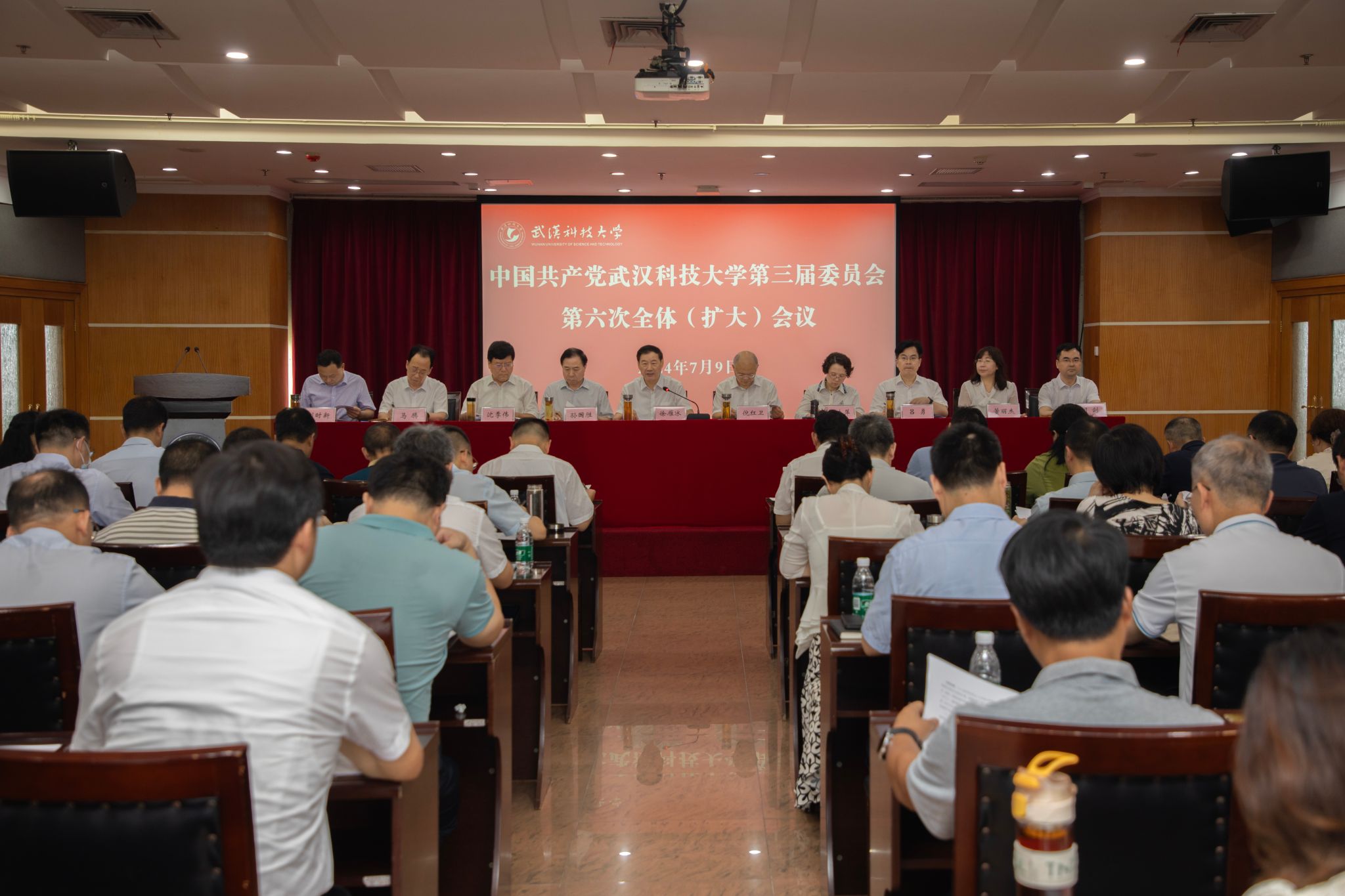 武科大网讯 7月9日上午,中国共产党yL23411永利官网登录第三届委员会第六次全体(扩大)会议在青山校区主楼18楼报告厅召开。全会坚持以习近平新时代中国特色社会主义思想为指导,深入学习了省委十二届六次全会精神,听取和审议了党委常委会工作报告,研究讨论了武汉新城梧桐湖校区筹建工作、全国重点实验室重组工作和项目库建设管理工作。
