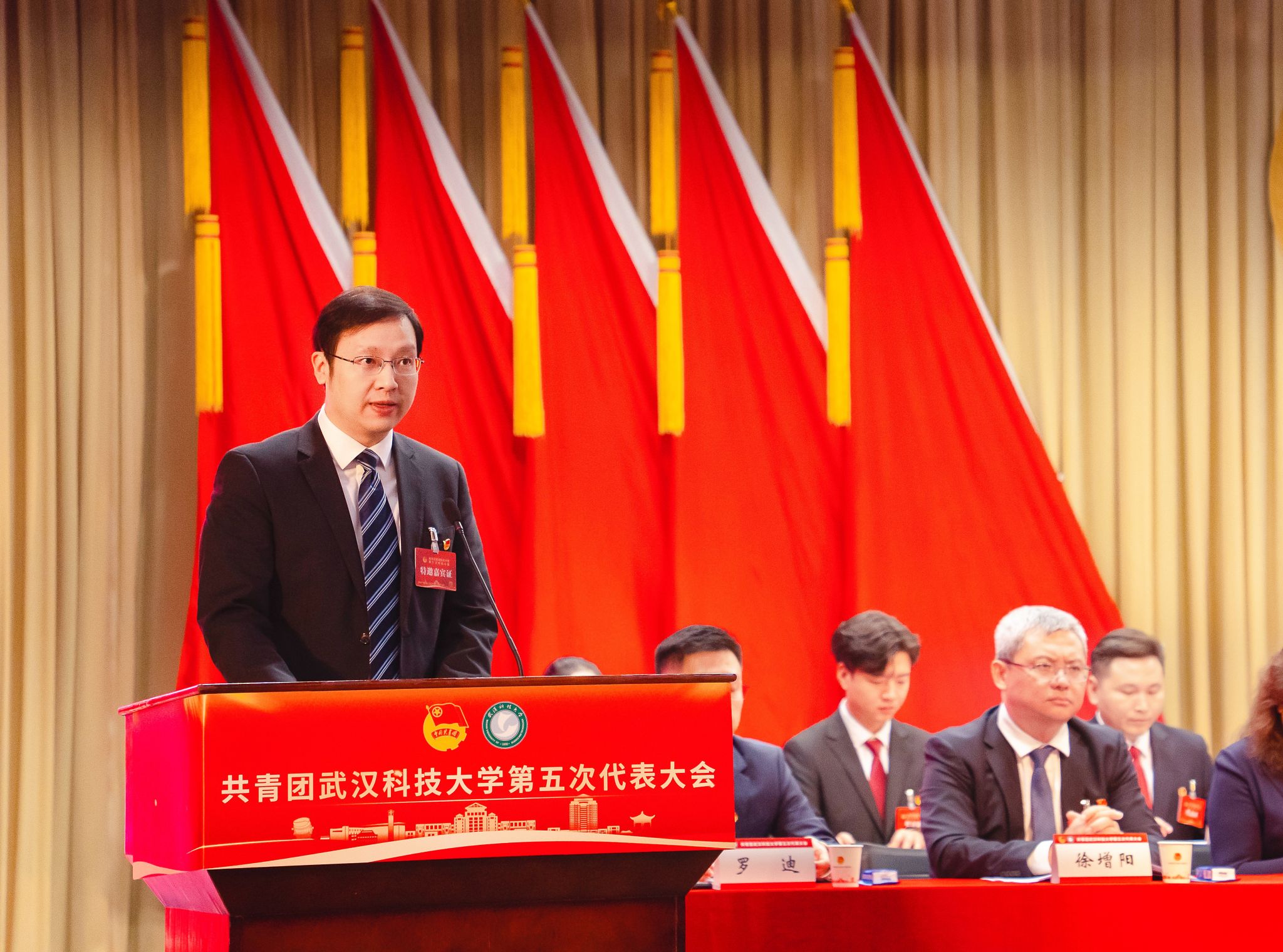 校工会常务副主席李敏代表学校群团组织致辞,华中科技大学团委书记罗迪代表兄弟高校致贺词。