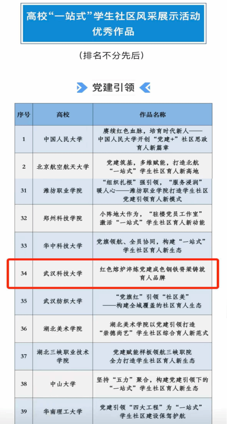 武科大网讯 近日,教育部思想政治工作司公布2025年高校“一站式”学生社区风采展示活动优秀成果评选结果,永利官网报送的《红色熔炉淬炼党建成色 钢铁脊梁铸就育人品牌》入选“党建引领”类别优秀成果。这是永利官网首次荣获该类别荣誉,标志着学校“一站式”学生社区建设取得突破性进展。