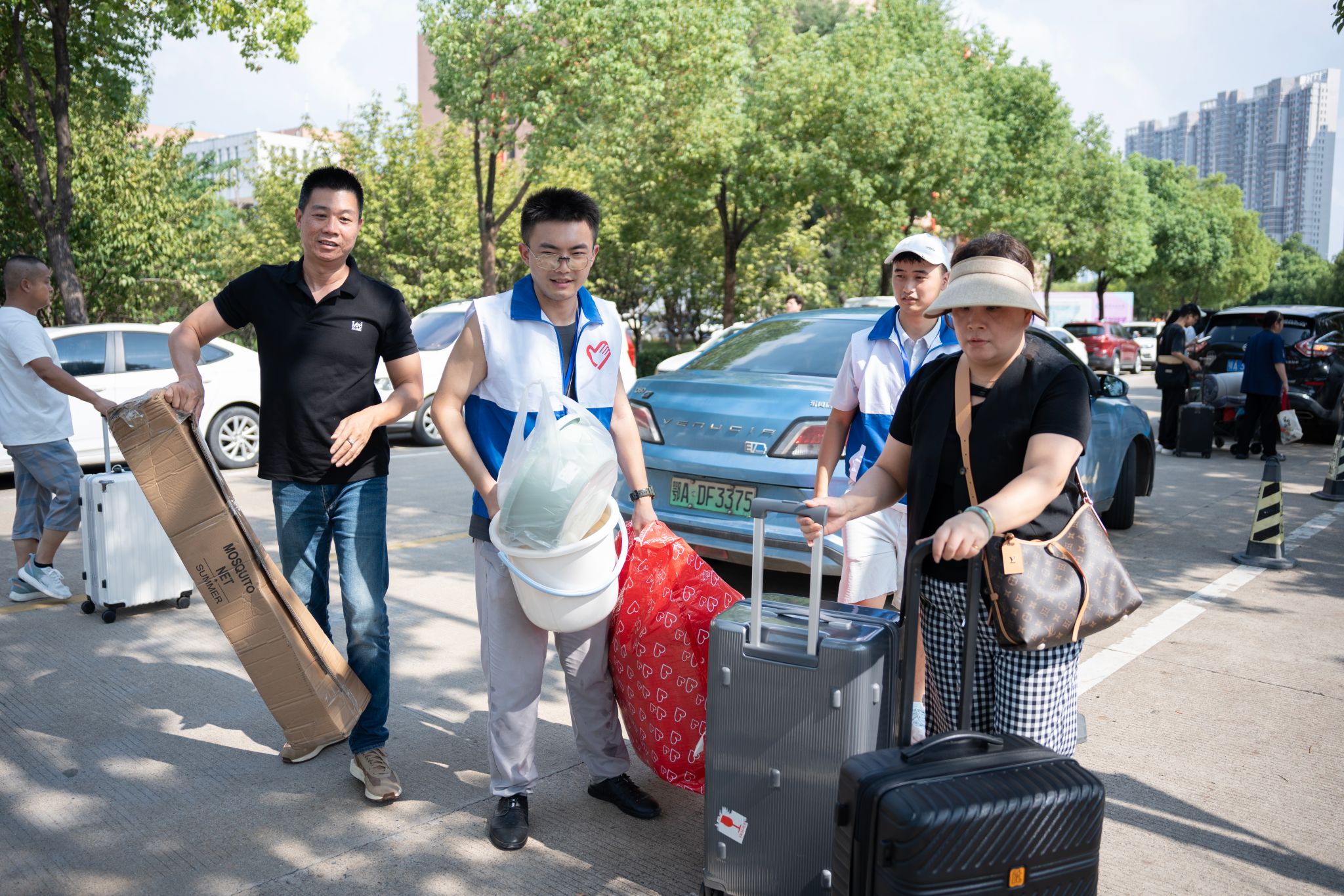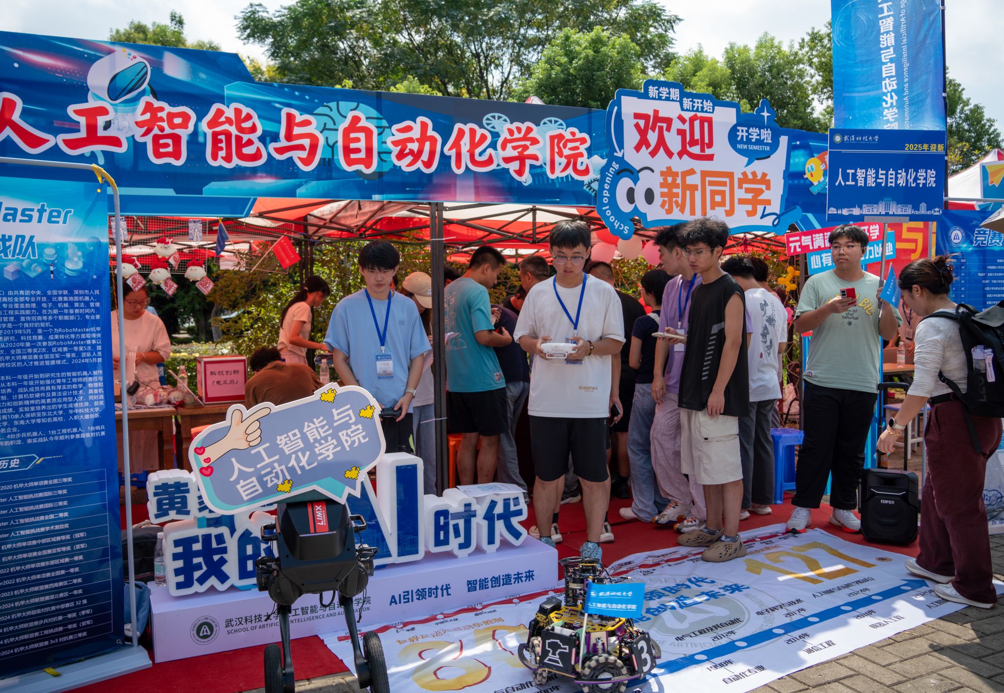 各学院迎新活动各具特色,亮点纷呈。“太酷啦!这机器人还能蹲起旋转!”在北园迎新点,人工智能与自动化学院的黑色步行机器人甫一亮相,便引来新生与家长们的阵阵惊叹。这个头顶小篮子、脚踩“风火轮”的机器人不仅能灵活地移动,还能与新生互动,帮助他们放置随身物品。该院新生辅导员介绍,希望通过这种方式,让新生第一时间感受到科技的魅力与专业的乐趣。