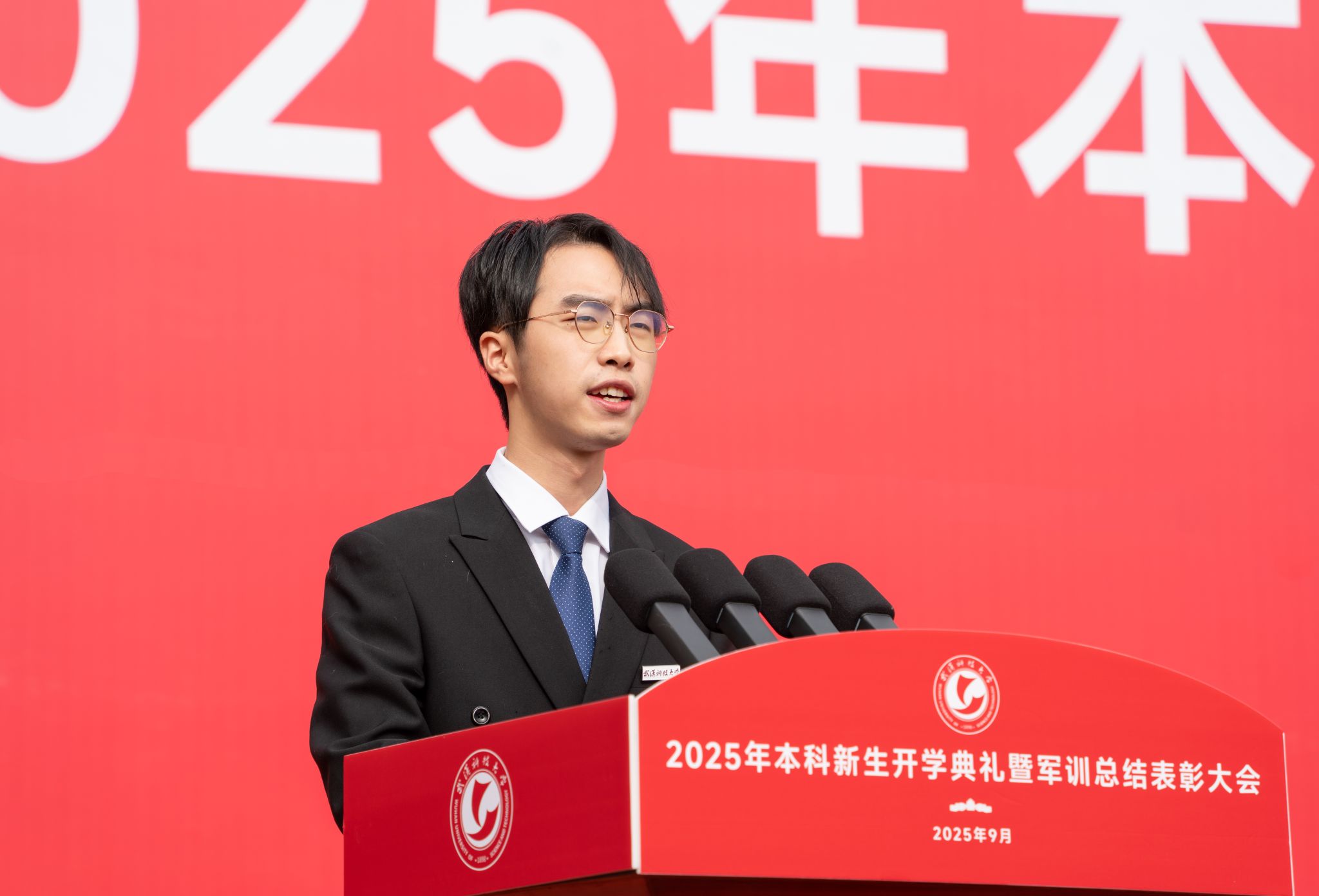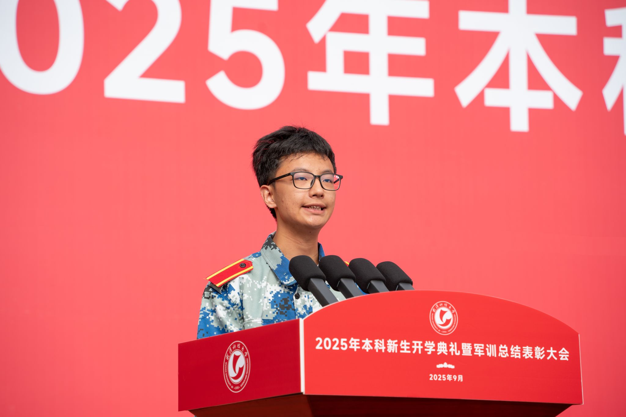 新生代表、人工智能与自动化学院2025级自动化类专业新生李祎哲回望军训期间的难忘点滴,代表全体新生向为入学筹备、军训保障倾力付出的领导、老师与教官致以衷心感谢。他代表全体新生郑重承诺,将始终恪守“厚德博学,崇实去浮”的校训,既要练就卓越的专业能力,又要涵养深厚的家国情怀,以青春之力书写精彩篇章。