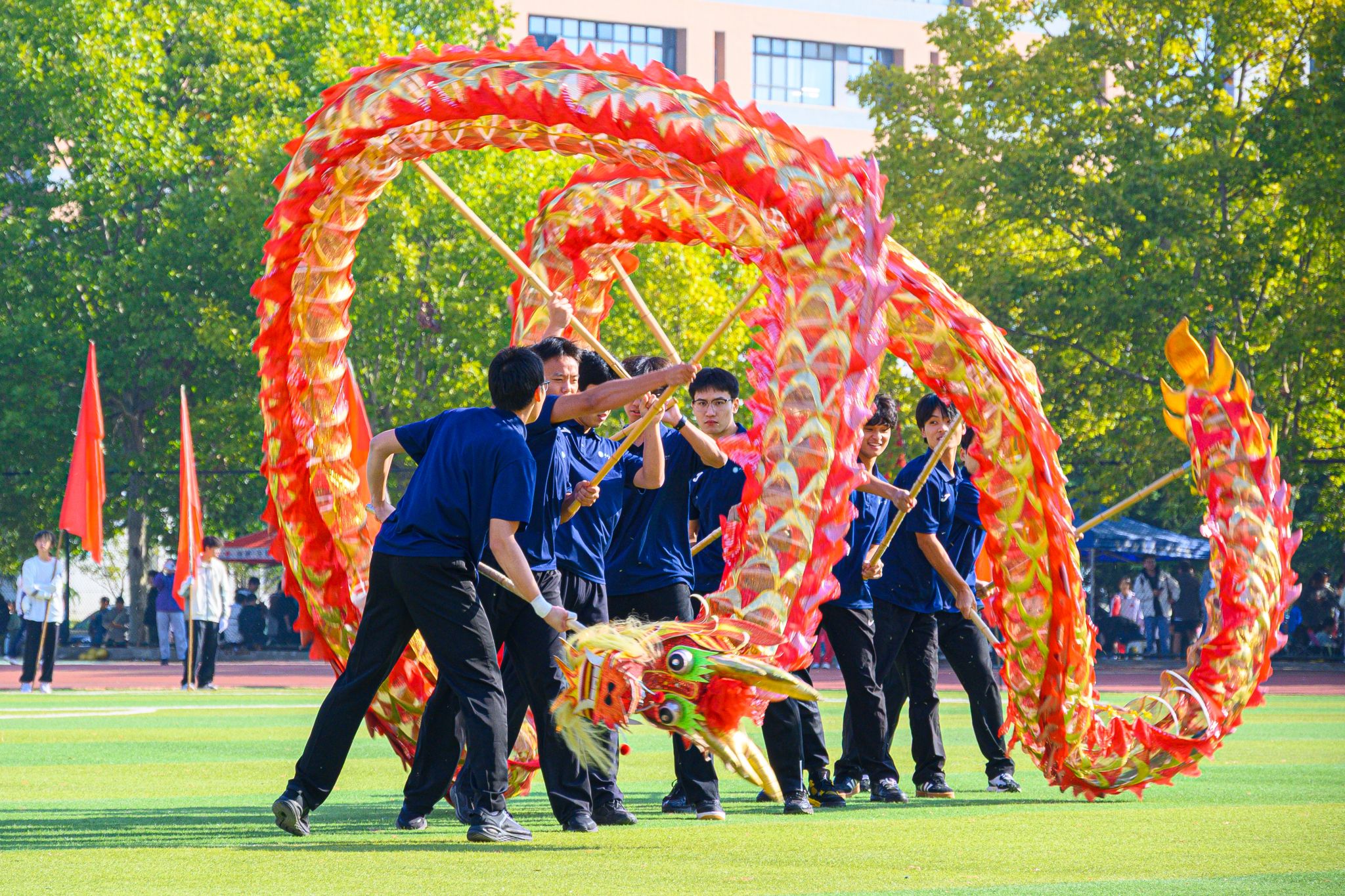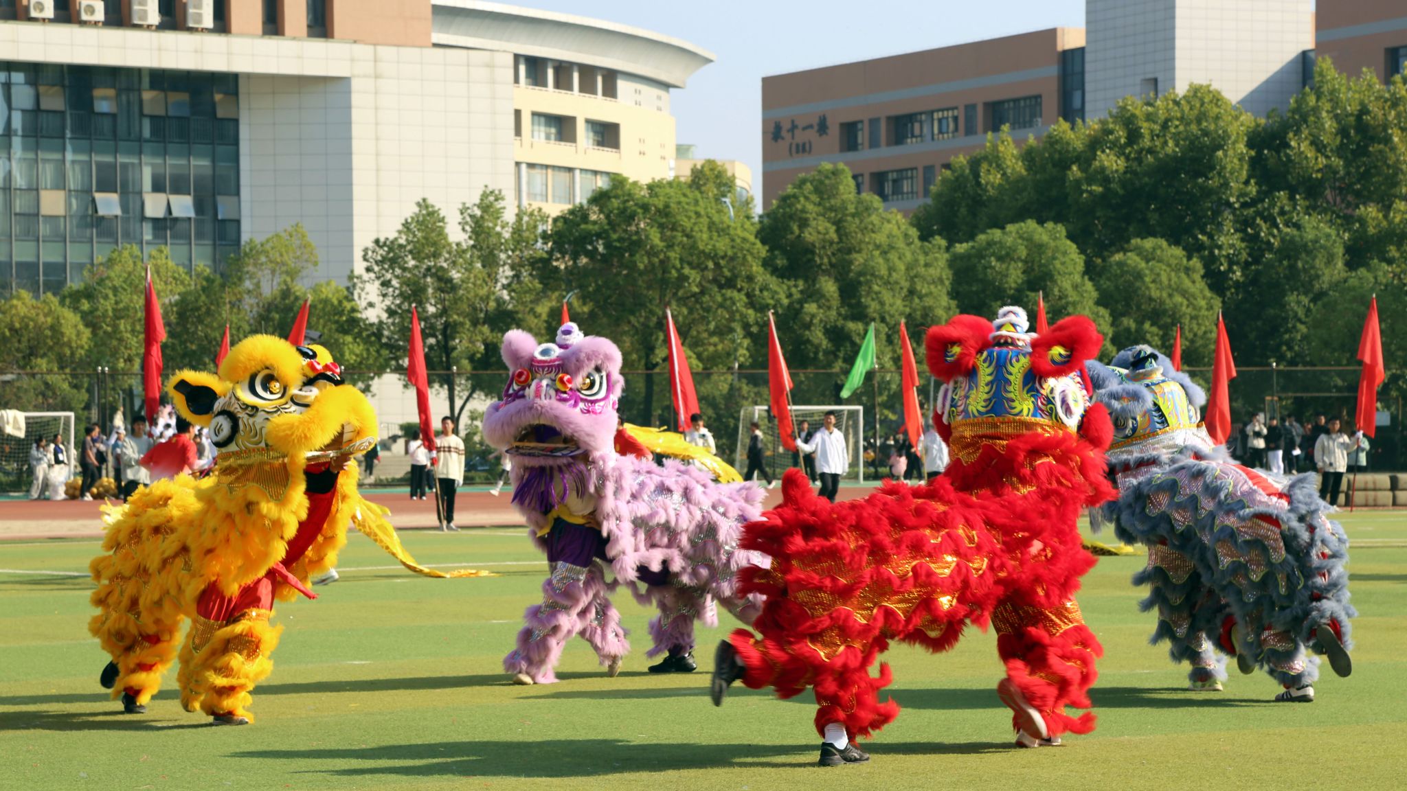 随后的学生团体操与舞龙舞狮表演,将现场气氛推向高潮。团体操表演动作整齐划一,洋溢着青春自信与活力;舞龙舞狮在喧天的锣鼓声中翻腾跳跃,为盛会送上吉祥祝福,展现了中华传统体育的独特魅力。