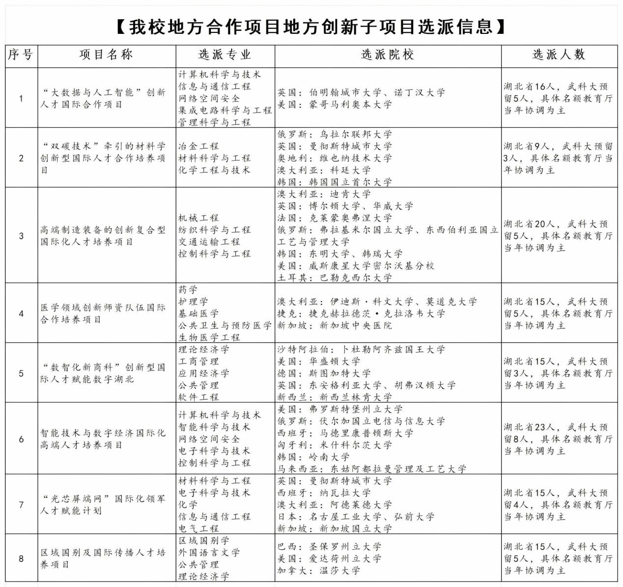 武科大网讯 近日,国家留学基金管理委员会公布2025年度 “西部地区人才培养特别项目、地方合作项目地方创新子项目”立项结果,永利官网申报的《智能技术与数字经济国际化高端人才培养项目》、《“光芯屏端网”国际化领军人才赋能计划》、《区域国别及国际传播人才培养项目》3项项目成功获批。新获批的3个项目紧扣国家战略需求与湖北省“51020”现代产业集群发展规划,深度契合学校“一主两翼”学科布局。至此,学校累计拥有该类地方创新子项目达8项,成为湖北省拥有此类地方项目数量最多的高校,彰显了学校在国际化人才培养和学科建设方面的综合优势。