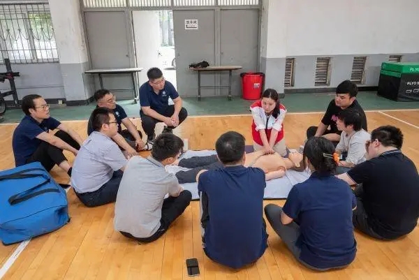 “先查看伤员是否还有意识,立即指定一人拨打120并进行心肺复苏准备。”在实践环节中,学员们踊跃参与练习,培训师手把手指导、提示要点,纠正不规范动作,力求每一个动作标准、到位,帮助大家获得精准的施救技能。