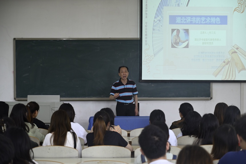 蓝布一盖,醒木一拍,折扇一开,评书起,四座皆静。6月7日,国家级非遗项目湖北评书省级代表性传承人付三元来到yL23411永利官网登录“魅力方块字”的课堂上,开展了以“湖北评书的艺术特色”为主题的讲座,与学生们一同迎接2023“文化和自然遗产日”。