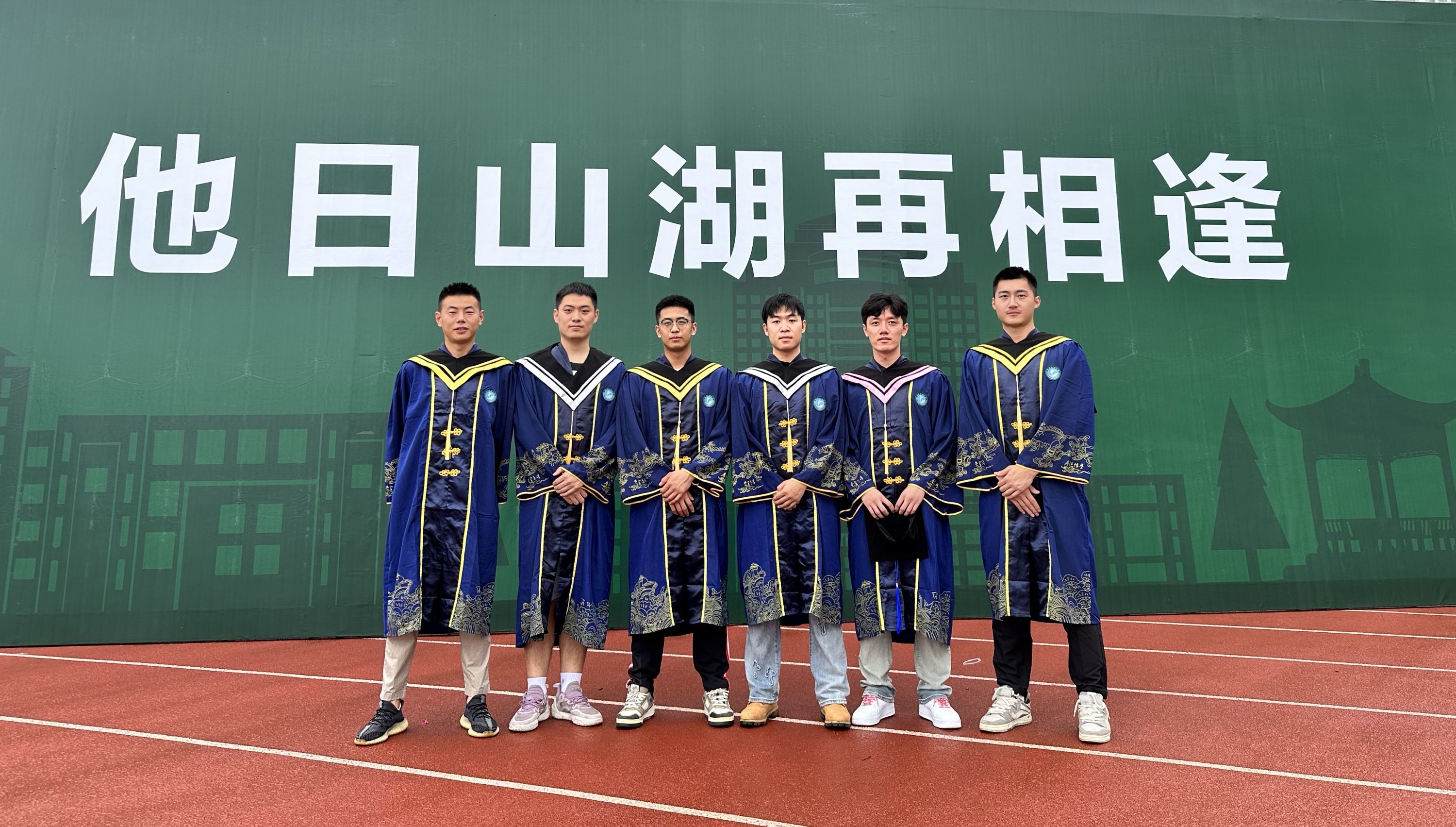 18日,学校毕业典礼活动上,武科大硕士毕业生陈杰(右二)和同学穿上学位服合影留念。