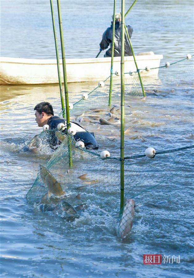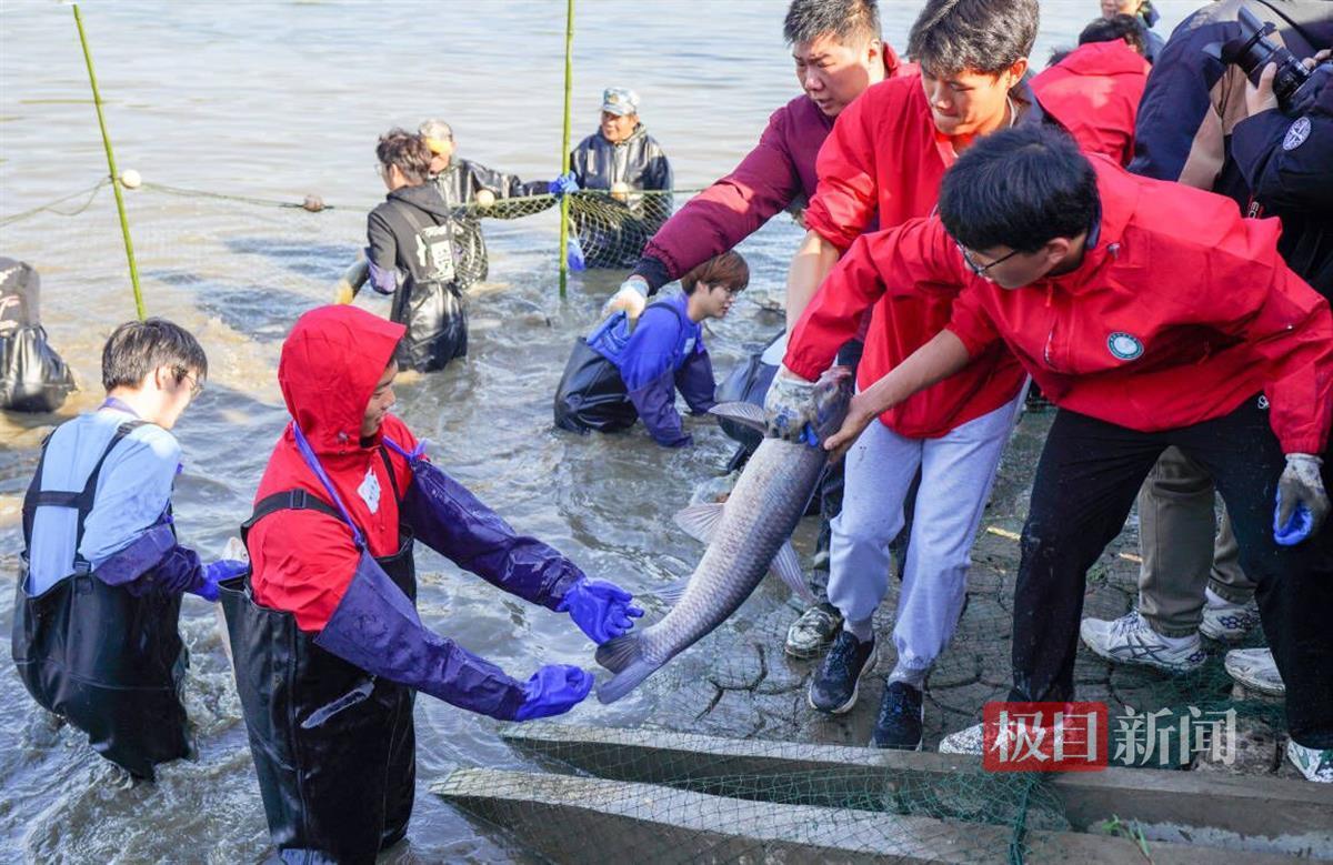 据介绍,今年1月学校投放了1万余斤鱼苗,5月组织学生喂鱼,10月下旬开始安排专人24小时值班护鱼,11月初开始放水赶鱼。当天早上,来自各学院的学生志愿者和后勤保障部的师傅一起拉网、下水捕鱼。