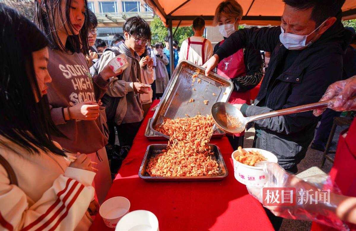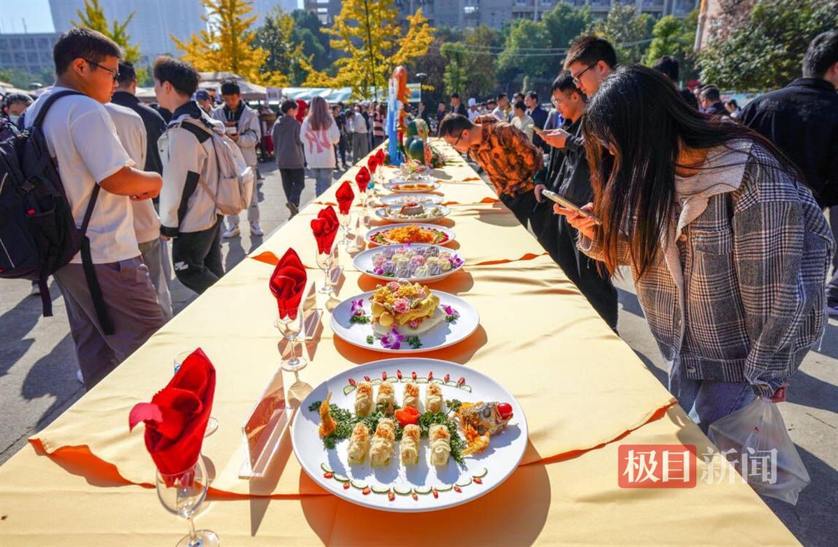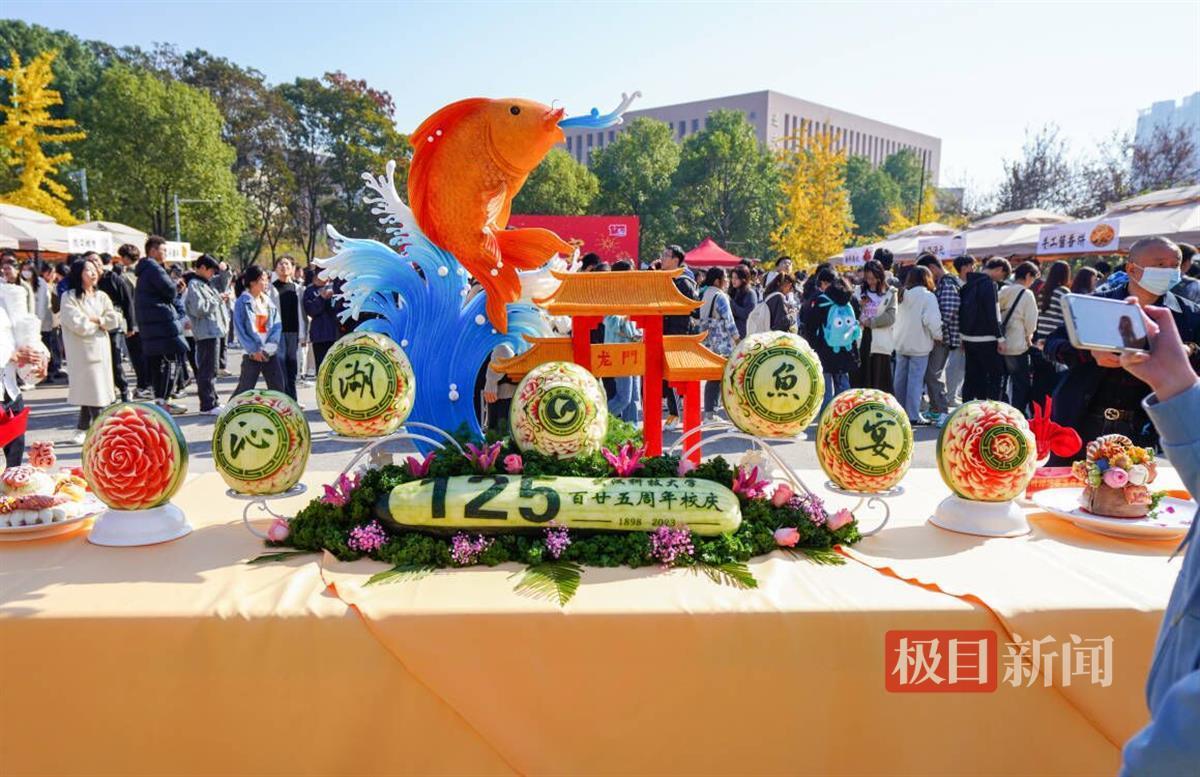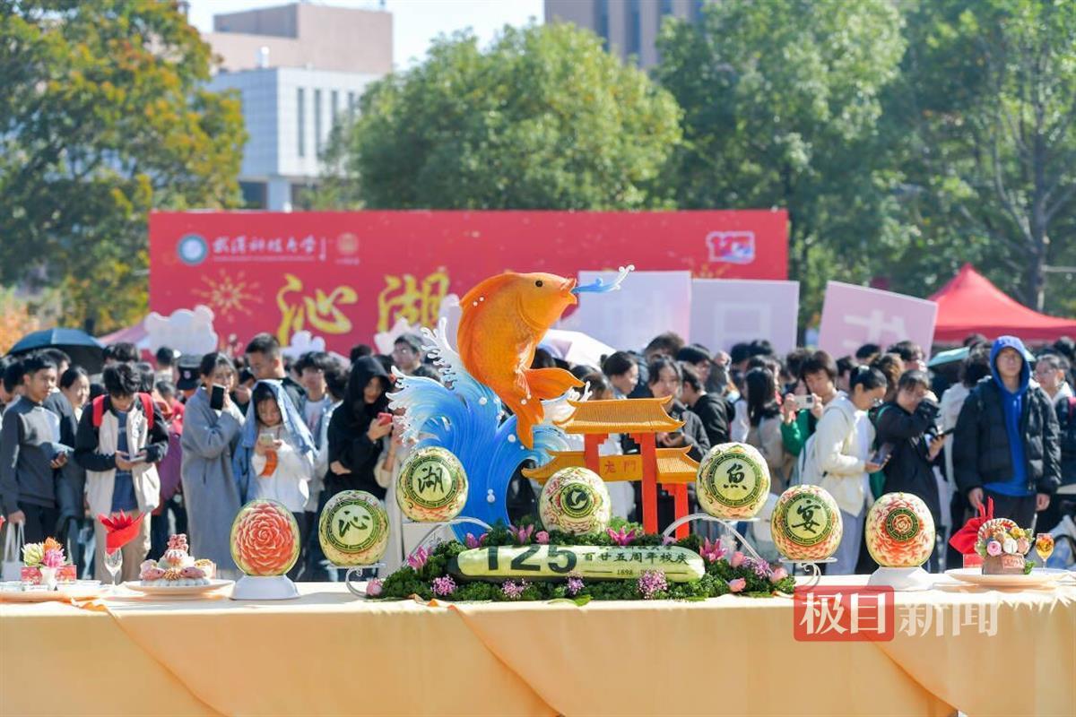 当天,武科大党委书记徐雁冰宣布沁湖鱼宴开幕。在该校南园餐厅广场的展台上,摆放着刻有“125”“1898-2023”等校庆元素的菜品,以沁湖鱼鲜为主材,由各餐厅厨师精心制作。餐厅门前的“小庙会”吸引了大量师生驻足,学校食堂的大厨现场制作特色小吃,酥炸肉丸、小鱼小虾、爱心花糕等10个摊位上的小吃供师生免费品尝。该校大一学生高延云表示,学校举办这样的活动,十分热闹又有文化氛围。