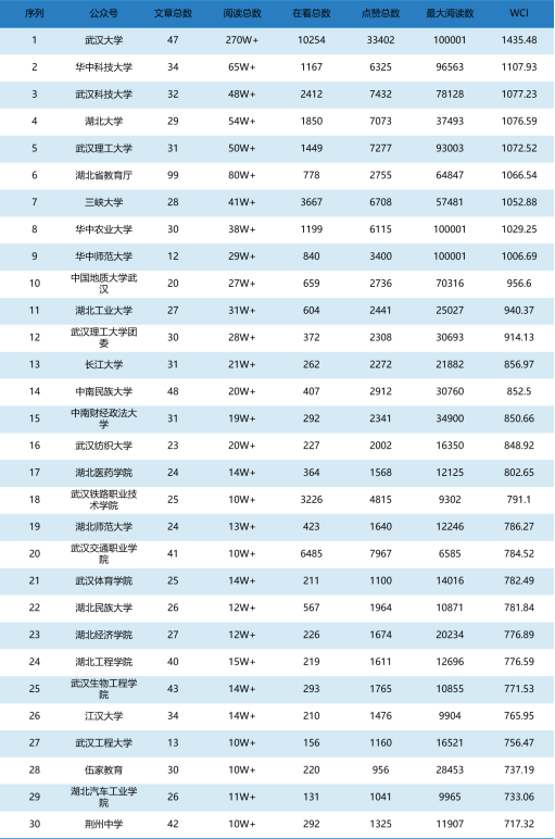 本期教育政务微信TOP30榜单中,整体排名变化有限。其中,“武汉大学”稳居第一,与上期保持一致;“华中科技大学”直冲第二,较上期有所上升;“yL23411永利官网登录”跃居第三,整体进步较大。