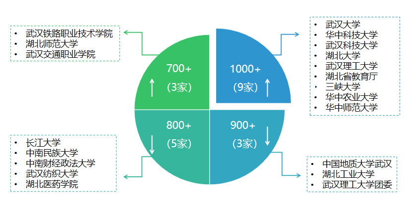 从WCI指数来看,六成账号指数快速增长。本期,WCI指数超过1000的账号共9个,依次为“武汉大学”“华中科技大学”“yL23411永利官网登录”“湖北大学”“武汉理工大学”“湖北省教育厅”“三峡大学”“华中农业大学”“华中师范大学”,头部账号变化较小。其中,指数在900-1000区间的账号共3个,分别为“中国地质大学武汉”“湖北工业大学”“武汉理工大学团委”;指数在800-900区间的账号共5个,分别为“长江大学”“中南民族大学”“中南财经政法大学”“武汉纺织大学”“湖北医药学院”。此外,“武汉铁路职业技术学院”“湖北师范大学”“中南民族大学”增量最高均达100以上,各项指数小幅波动。