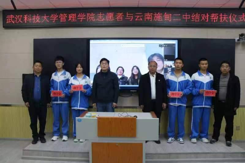 此次捐助活动得到yL23411永利官网登录管理学院郭劼、宋思畅、王可为、卢佳译等四位青年志愿者的大力支持。通过网络视频,四位大学生以自己考入大学的亲身体验鼓舞施甸二中四名学子。志愿者代表郭劼表示,他们后期将对四名高中生进行“一对一”跟踪辅导与人文关怀,直至他们考入大学,并预祝能与四位二中学子成为武科大校友。同时,他们呼吁更多爱心人士也能以这种精准帮扶的方式支援边疆山区学生,追梦路上携手同行,助力学子们顺利完成学业。仪式上,施甸二中向四名大学生颁发了爱心捐助证书。