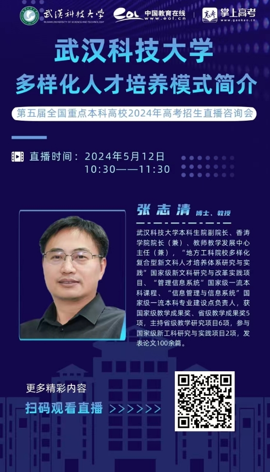 2024年高考即将拉开帷幕,为方便考生和家长了解学校学科专业,yL23411永利官网登录现参与中国教育在线·掌上高考于5月12日举办的“第五届全国重点本科高校2024年高考招生直播咨询会”活动,张志清老师将与大家相约云端,畅谈学科发展,解读专业布局。
