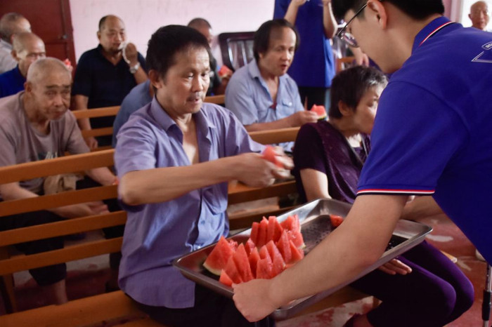图为实践团队成员为养老院老人送上西瓜。钱雨飞 供图