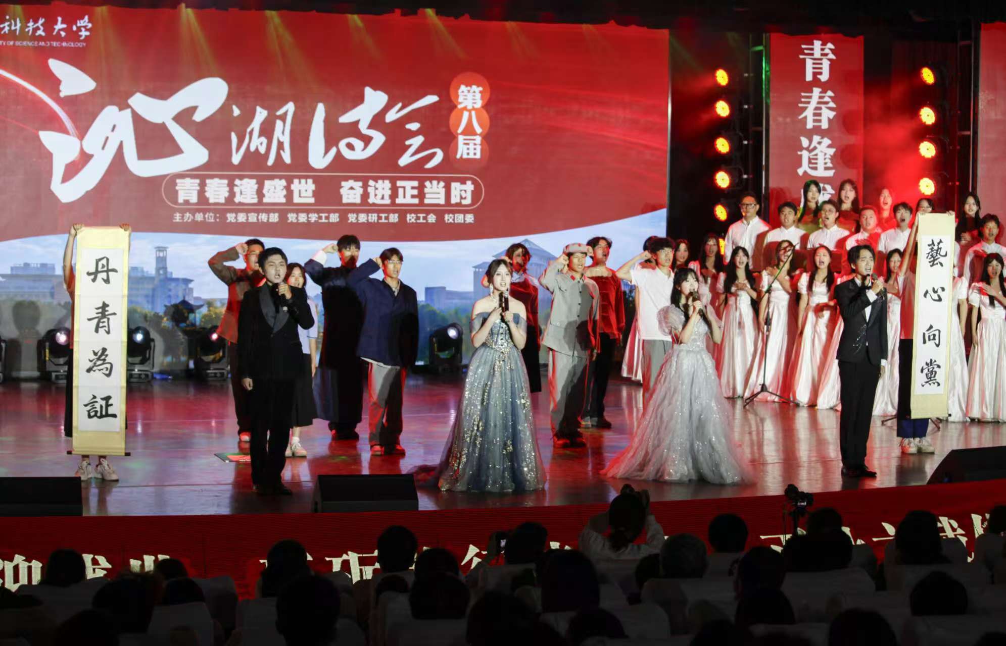 本届诗会以“青春逢盛世 奋进正当时”为主题,分为《致敬·光辉历程》《赓续·青春荣光》《奋斗·伟大梦想》三个篇章。历时五个月,各学院师生自主创作诗朗诵、舞台剧、民乐歌舞等多种形式的表演作品,充分展示了武科大学子勇挑时代担当的新时代青年面貌。