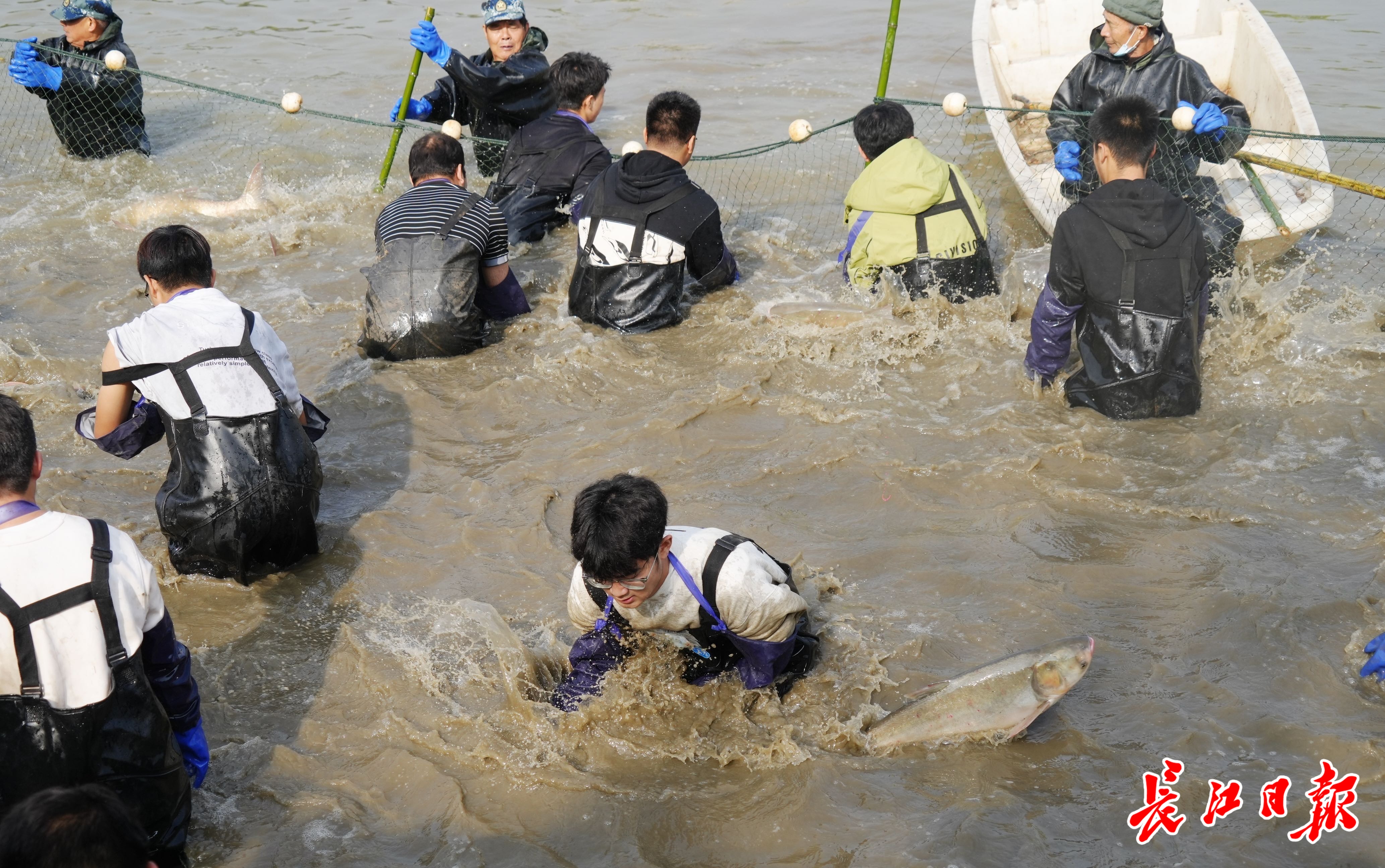 11月21日,yL23411永利官网登录举办第十届沁湖鱼宴,师生一起下网捞鱼。 记者何晓刚 摄