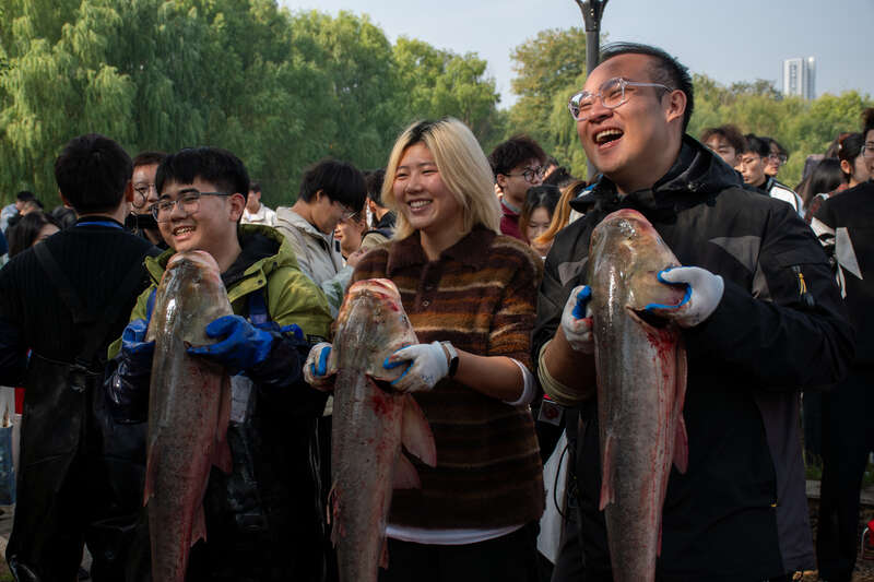 16岁的外国语学院大一新生刘好好在岸边为鱼称重,看着一条条少见的大鱼被搬到称台,她感到十分新奇:“太热闹有趣了!鱼都好大!有口福了!”