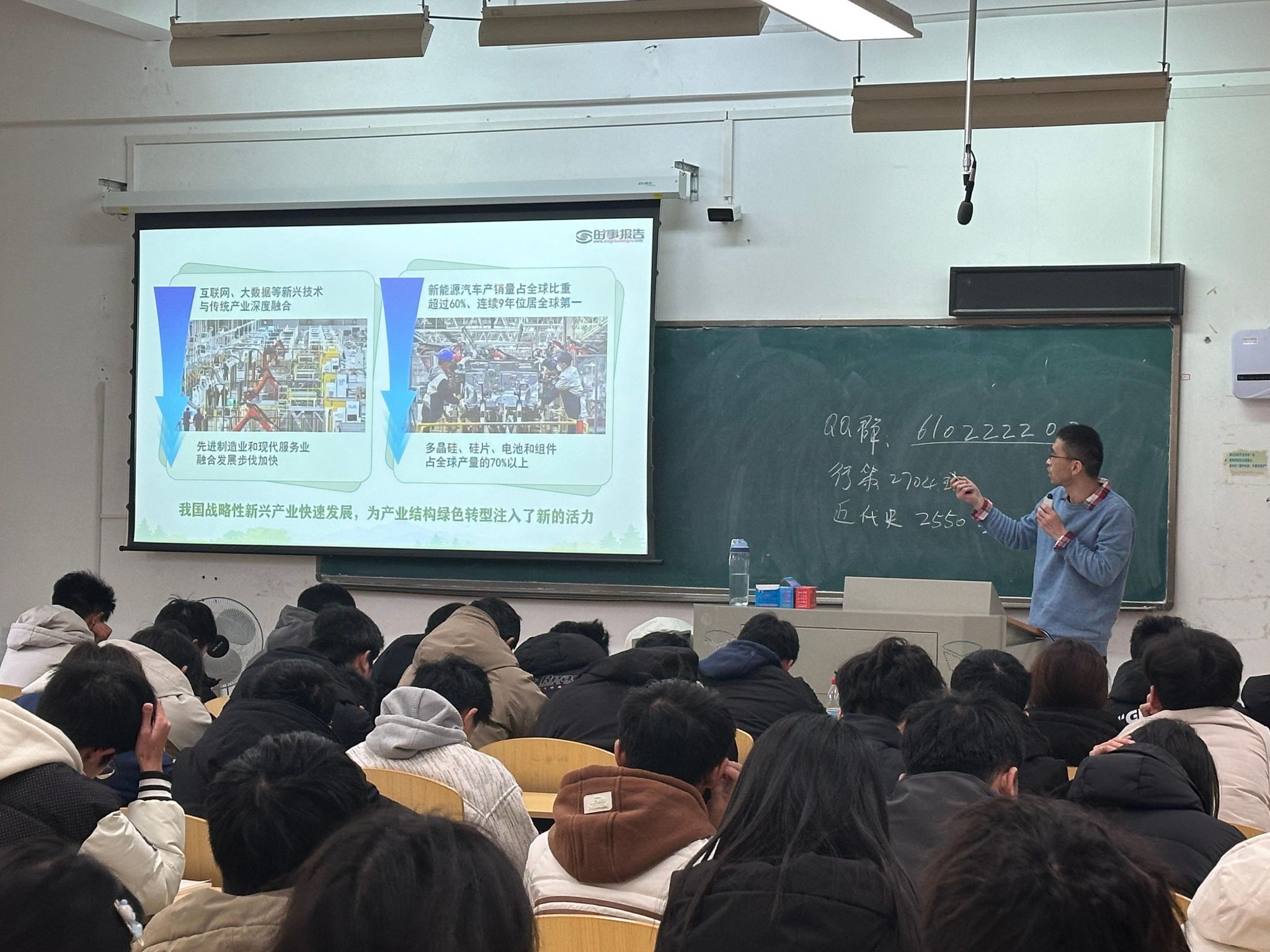 《秧bot》AI赛博秧歌引发对产业转型的思考,严禁露天焚烧秸秆政策的新变化,浏阳烟花秀背后的安全隐患……在主楼11203教室,马克思主义学院教师王目坤将时事新政巧妙融入课堂,以独特视角引导学生思考“厚植绿色底色,建设美丽中国”的主题。他鼓励学生:“每个人都是美丽中国建设的参与者,无论是在科技创新的前沿,还是在日常生活的点滴中,都应秉持绿色发展理念,为实现人与自然和谐共生的现代化贡献力量。”